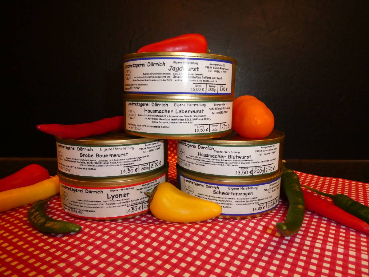 Grobe Bauernwurst: Zutaten: 85% Schweinefleisch, Speck, Zwiebeln, jodiertes Speisesalz, Konservierungsstoff E 250, Gewürze (enthält Sellerie, Senf) Stabilisator E 450a, Antioxidationsmittel E 300, Würze, Dextrose, Laktose, Geschmacksverstärker E 621