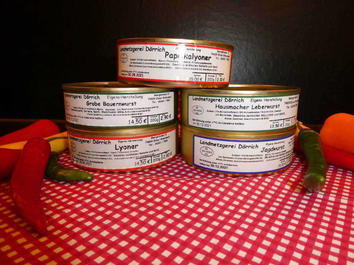 Grobe Bauernwurst:Zutaten: 85% Schweinefleisch, Speck, Zwiebeln, jodiertes Speisesalz, Konservierungsstoff E 250, Gewürze (enthält Sellerie, Senf) Stabilisator E 450a, Antioxidationsmittel E 300, Würze, Dextrose, Laktose, Geschmacksverstärker E 621